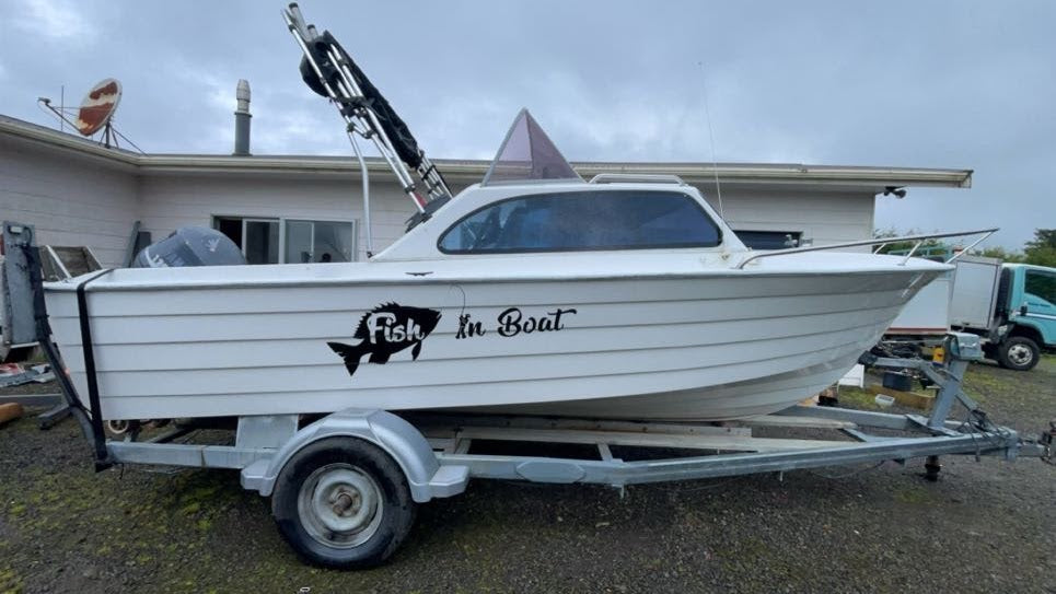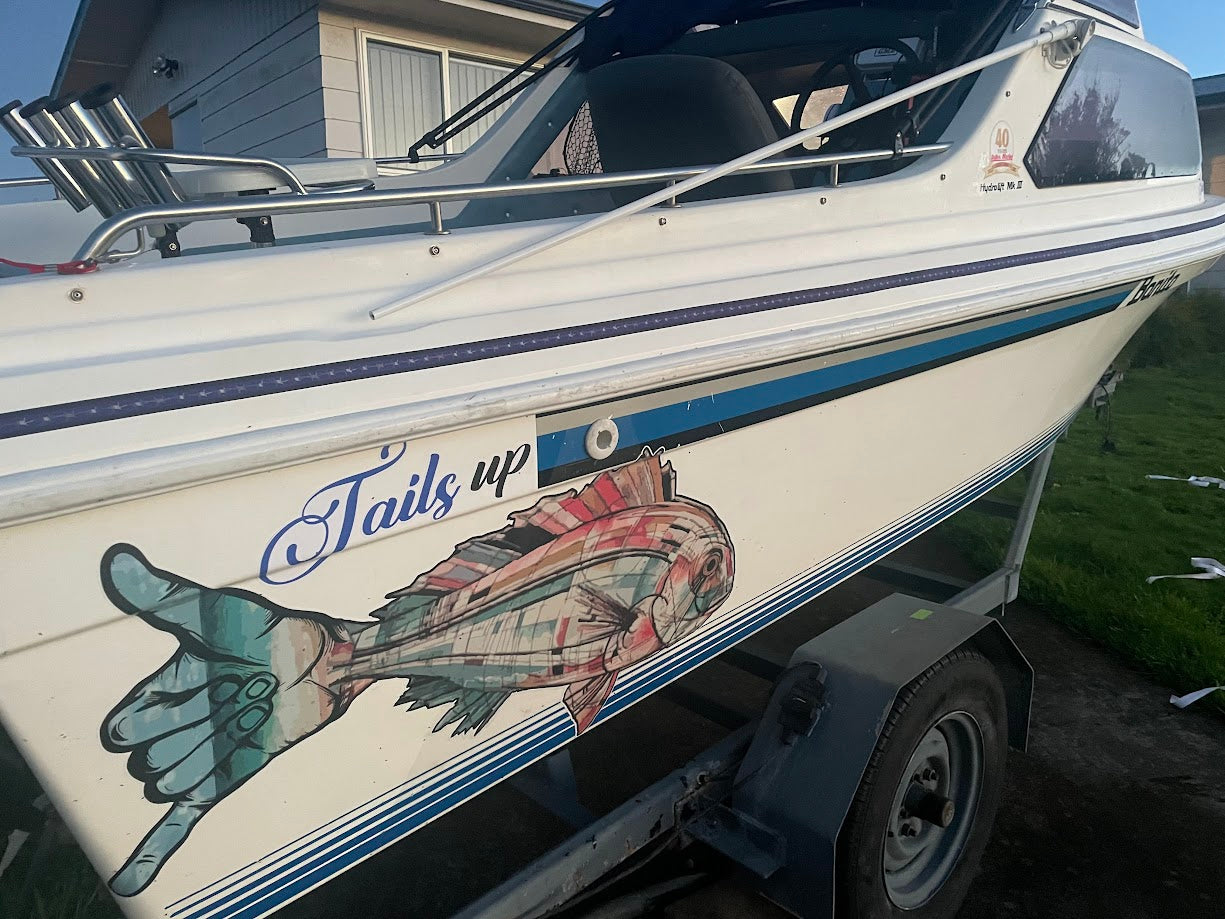 Custom marine decal featuring a “Chur Fish” artwork and flowing “Tails Up” script. A slick mix of humour, Kiwi attitude, and clean design, this one’s made to turn heads at the ramp and the reef. Proof your boat can have as much personality as its captain.
