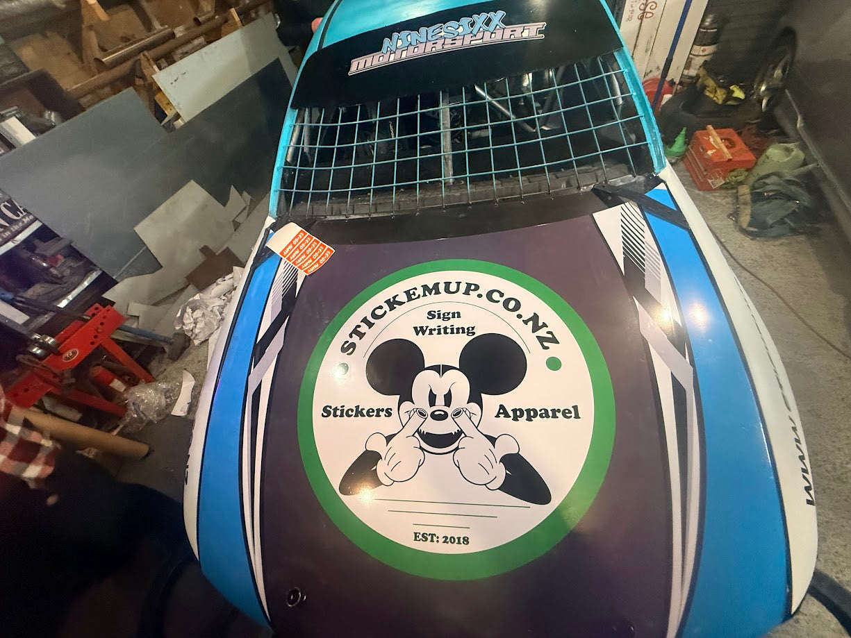 This bonnet wrap turned the Ninesixx Motorsport machine into a rolling billboard of attitude. Featuring the iconic Stick Em Up logo front and centre, it’s a statement piece built for racers who aren’t afraid to stand out on the grid.