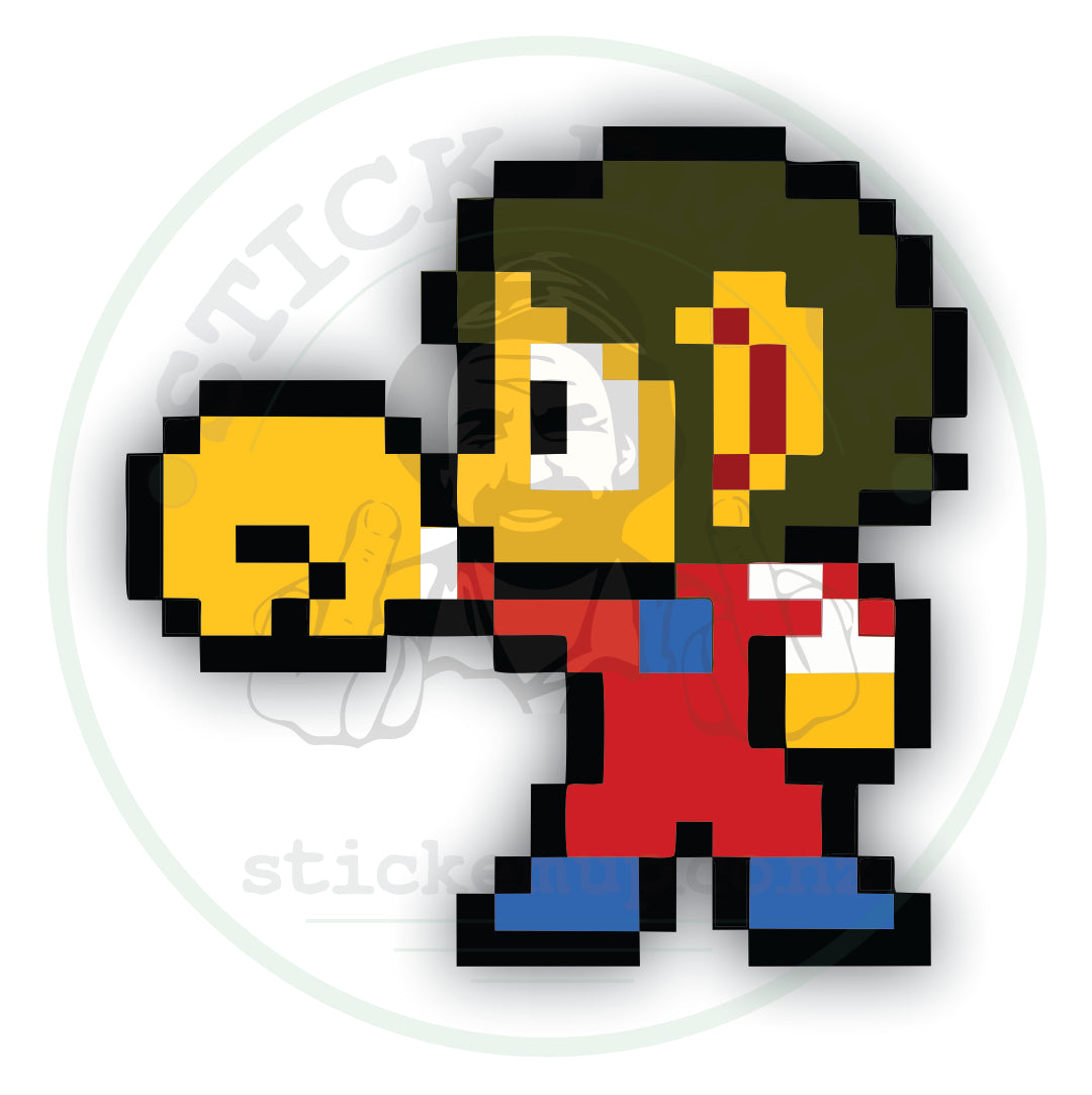 Step back into the golden age of gaming with our Alex the Kid sticker! Inspired by the legendary 1986 classic, this sticker is a must-have for retro gamers who grew up mastering side-scrolling adventures and smashing through rock-paper-scissors battles.