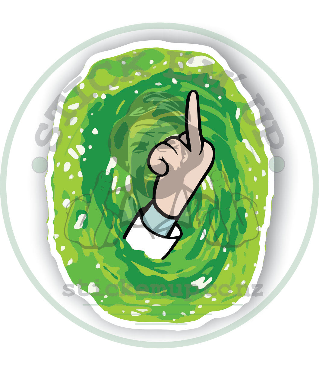 Meet the Flippin Rick sticker, a must-have for fans of the legendary Rick Sanchez. This eye-catching sticker features Rick's hand emerging through his signature green portal, flipping the bird with unapologetic flair. Perfect for laptops, car windows, or anywhere you want to add a touch of rebellious sci-fi humor, the Flippin Rick sticker is a bold declaration of your love for the mad scientist's irreverent adventures. Ideal for young adults and enthusiasts of the bizarre, it's a fun way to showcase your affinity for the outlandish and unpredictable world of Rick and Morty.