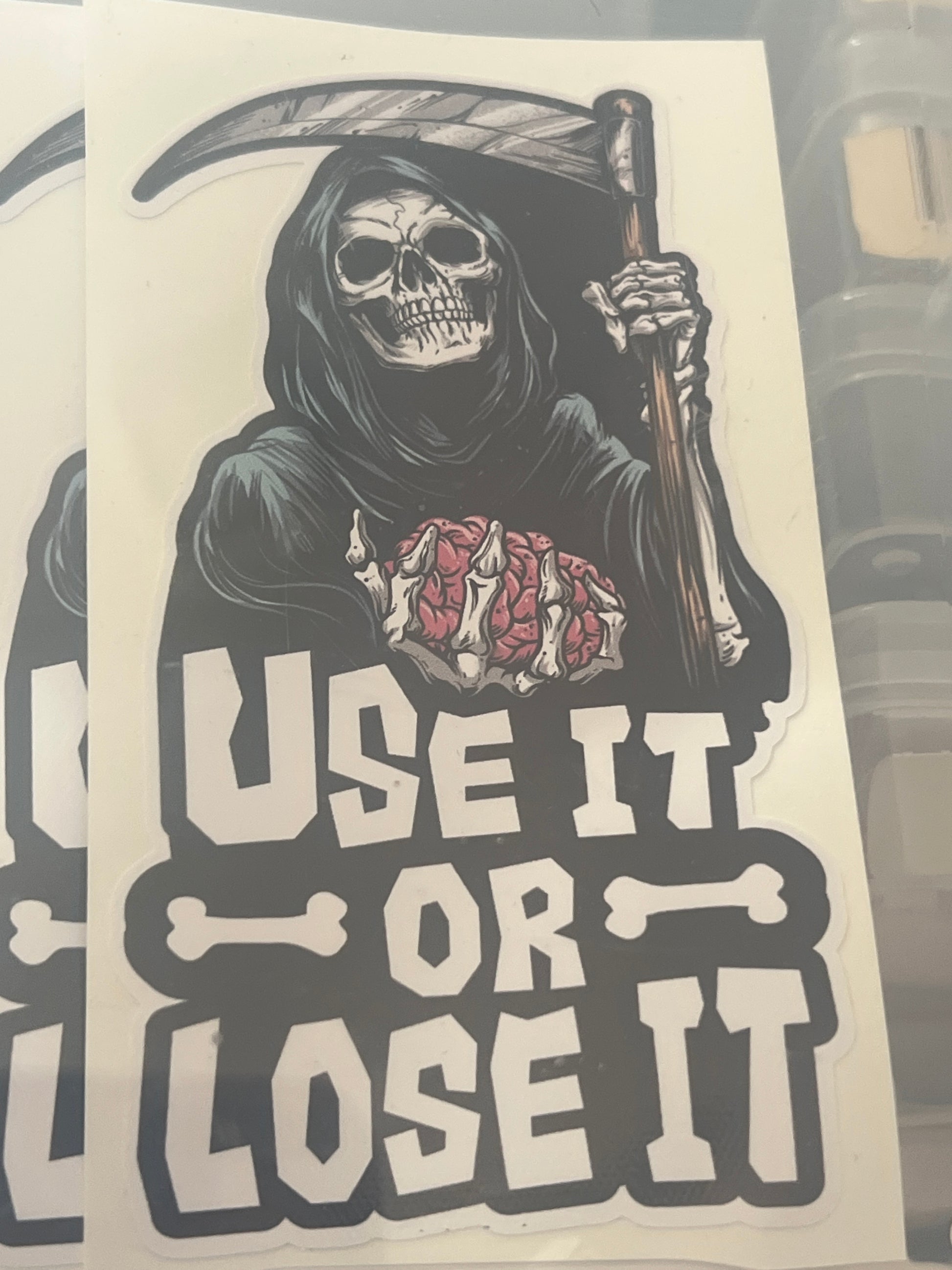 Death waits for no one — and neither does common sense. This savage Use It or Lose It sticker features the Grim Reaper himself, gripping a scythe in one hand and a juicy pink brain in the other, ready to remind everyone what happens when you don’t use your head.